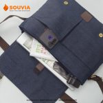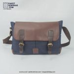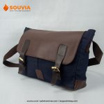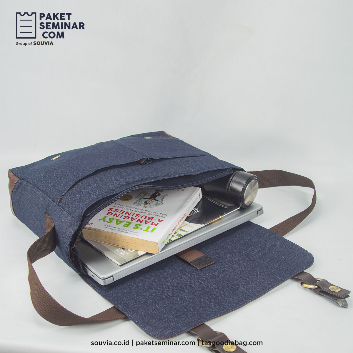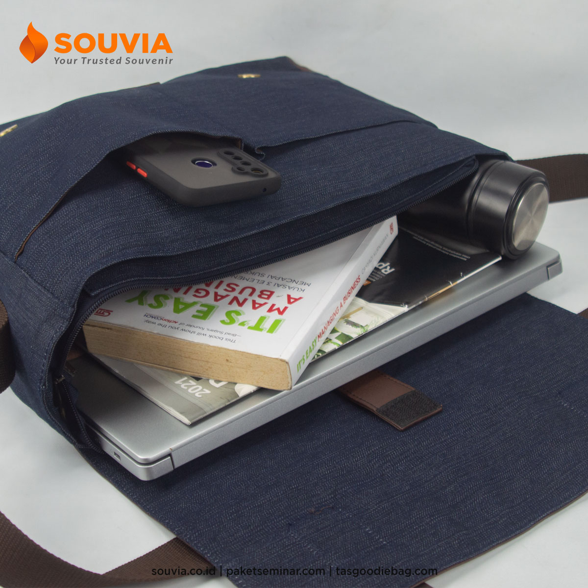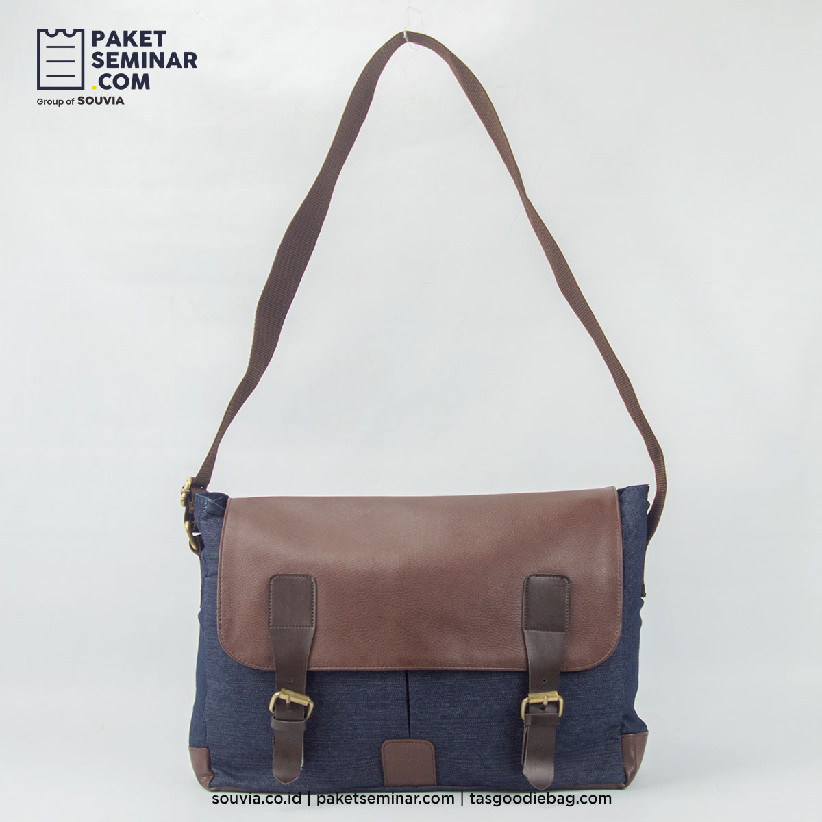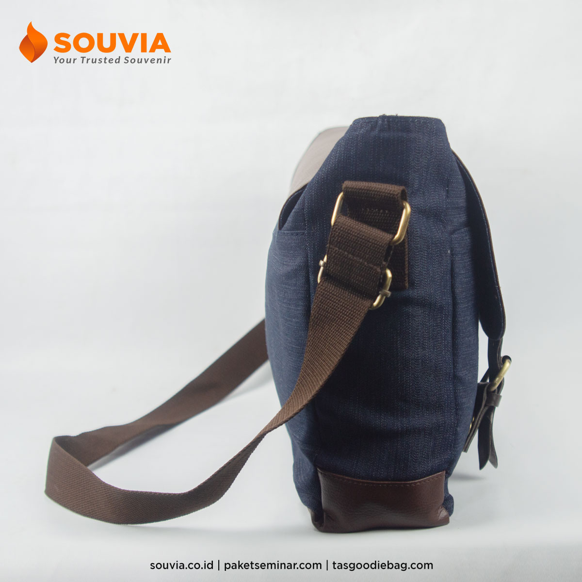 Shoulderbag berbahan denim dengan warna navy, memiliki 1 kompartemen utama dan 2 kompartemen kecil tambahan di bagian depan, dapat di branding dengan emboss atau sablon.